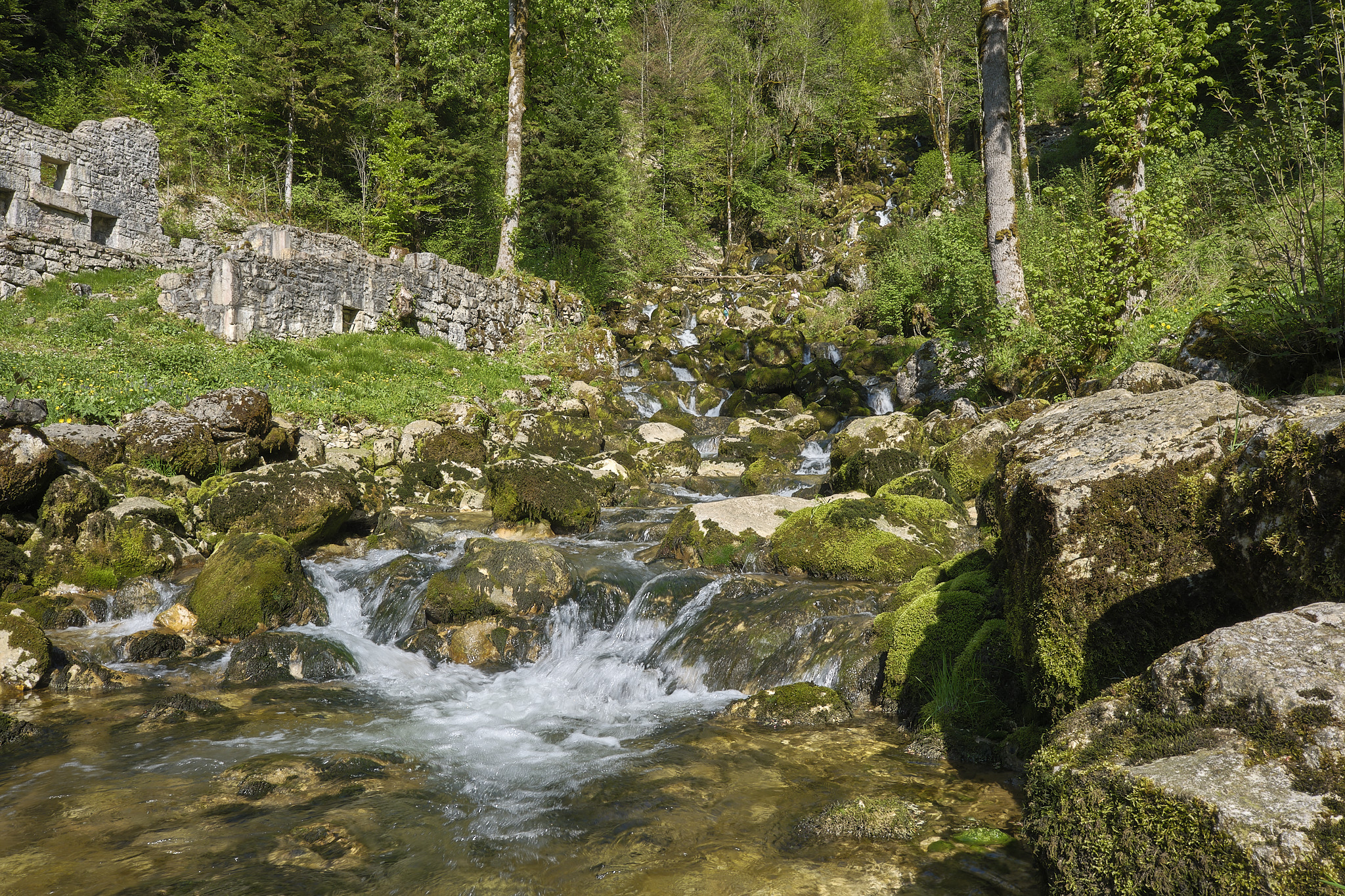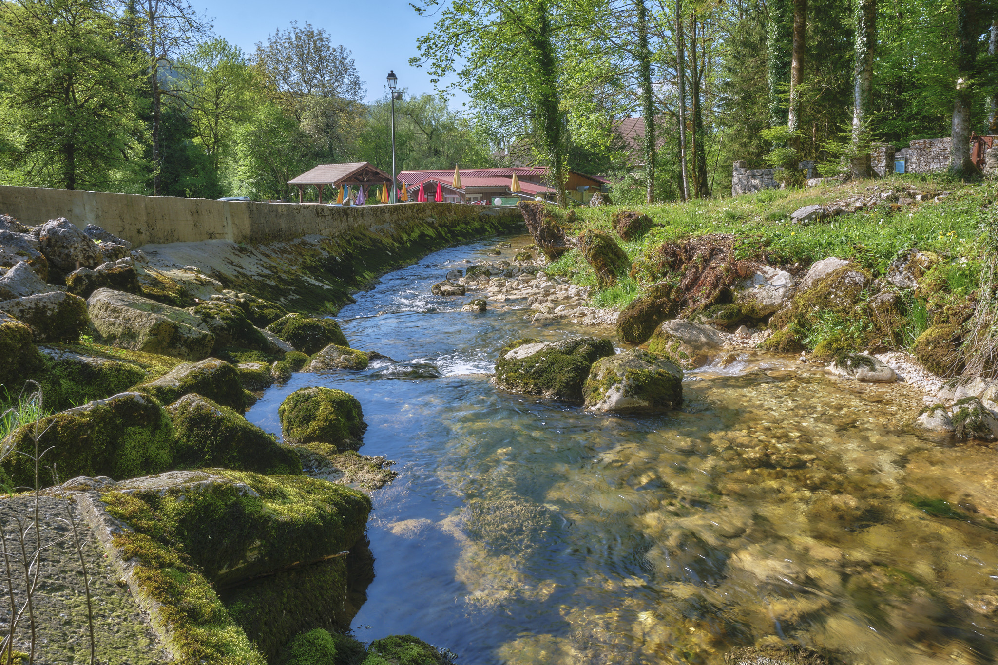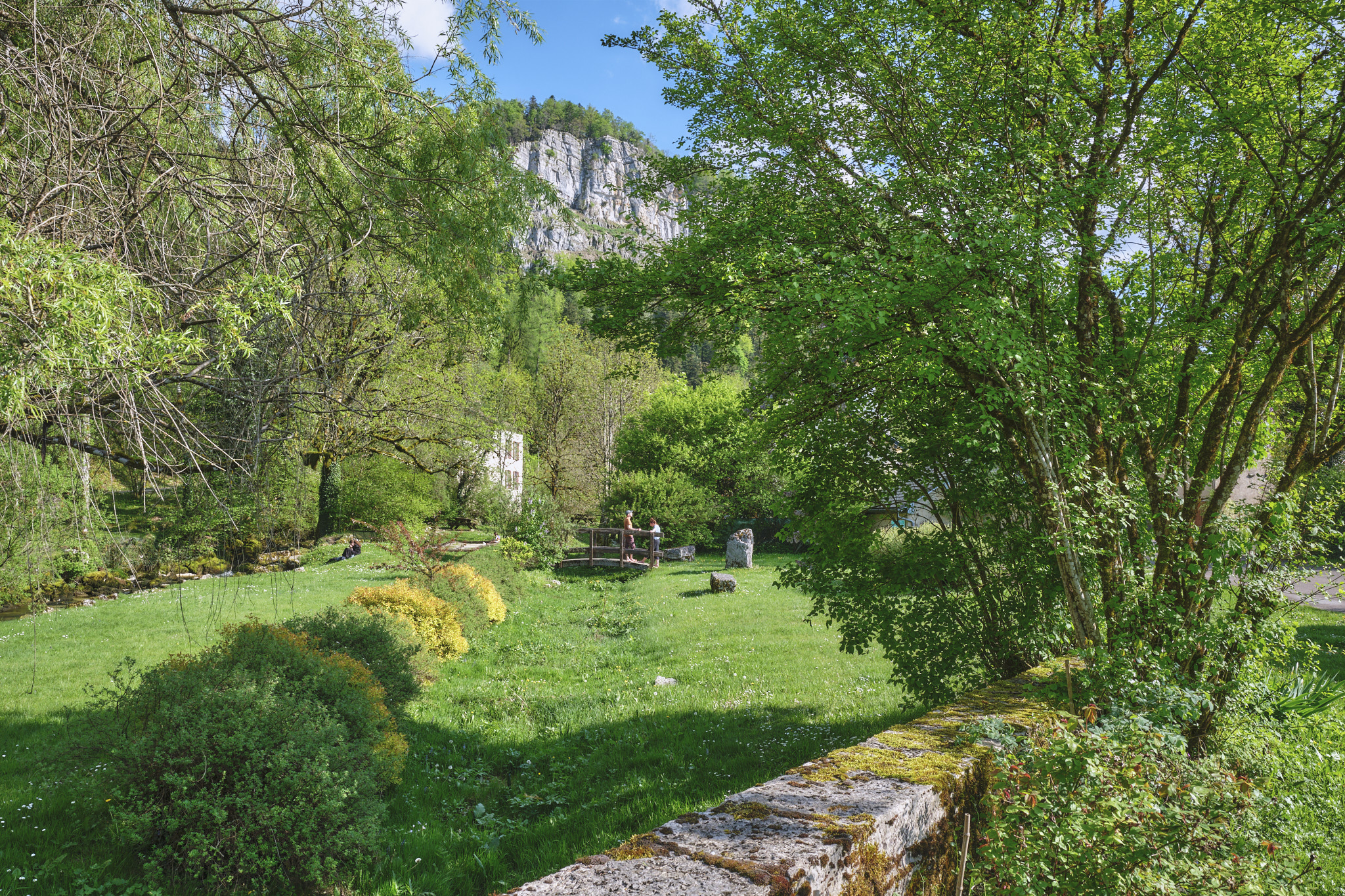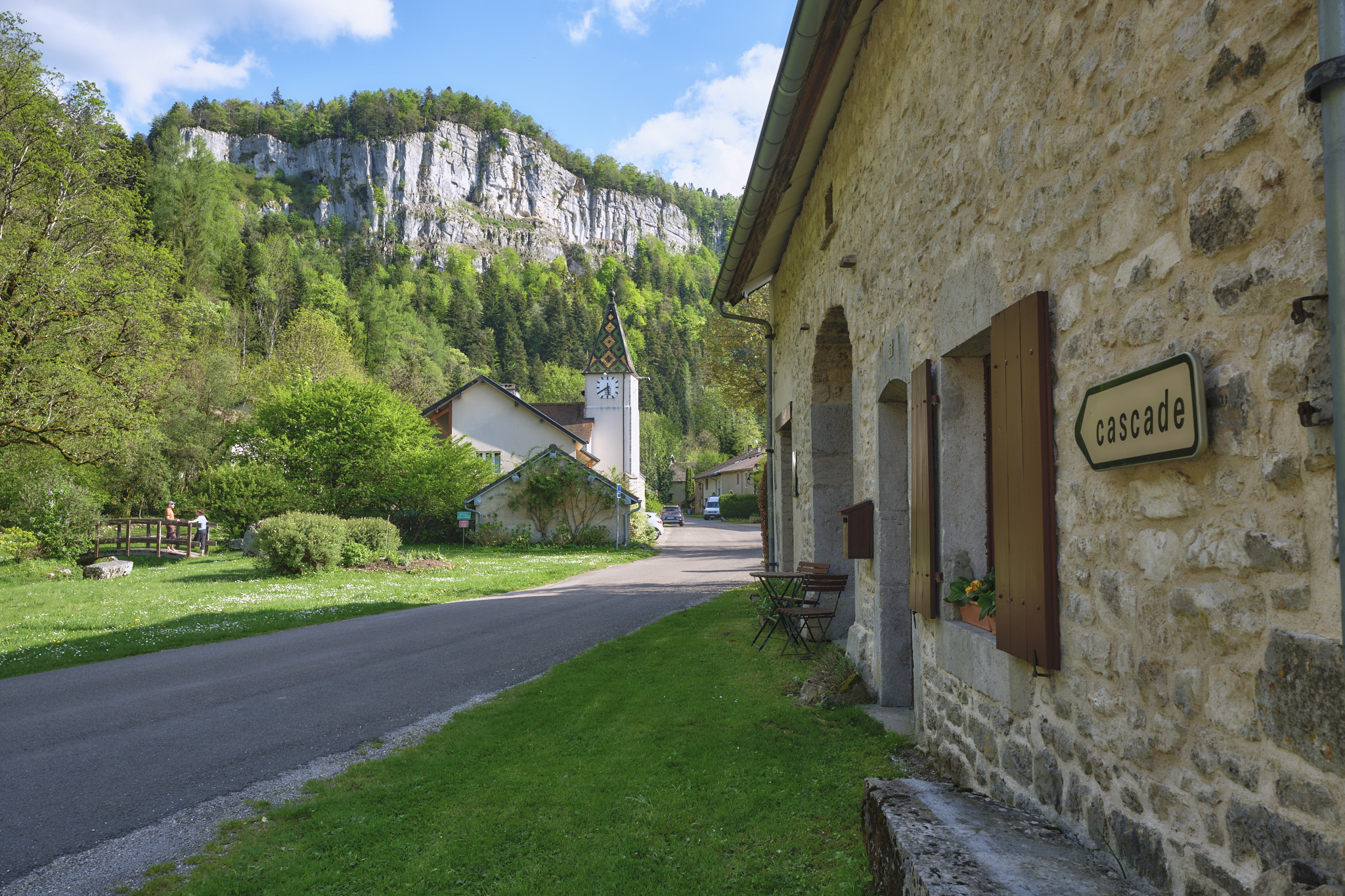 Au fond de la Reculée de La Frasnée naît le Drouvenant depuis une nappe souterraine sous le plateau.
