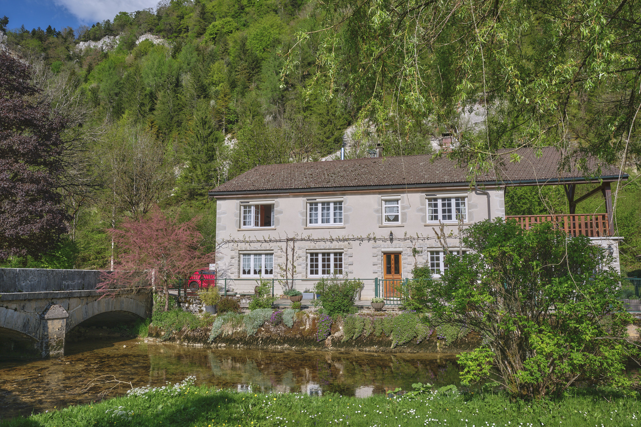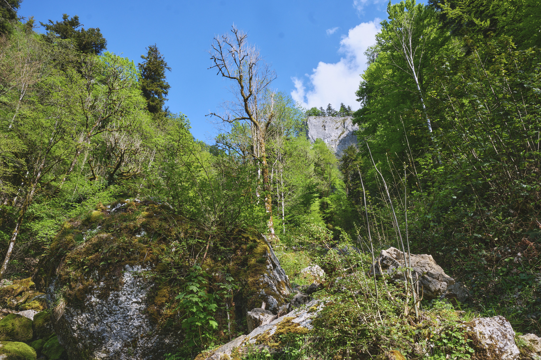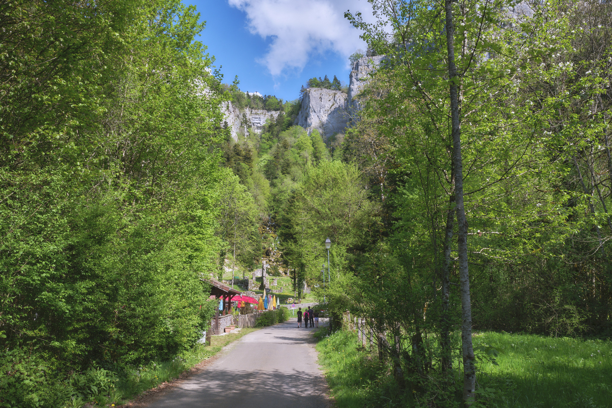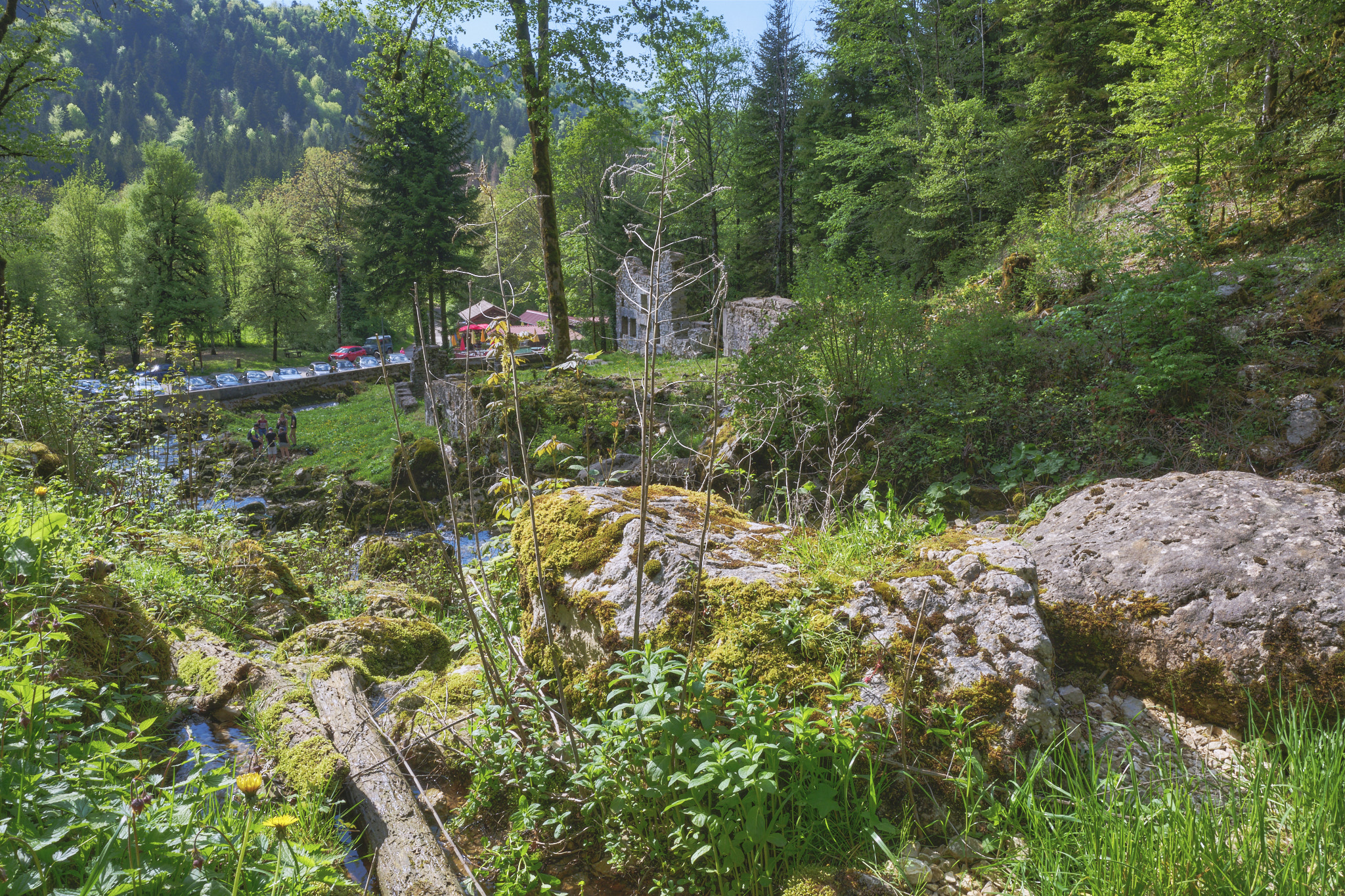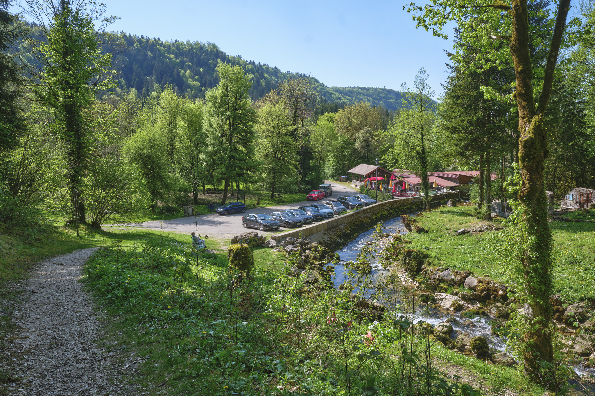 Au fond de la Reculée de La Frasnée naît le Drouvenant depuis une nappe souterraine sous le plateau.