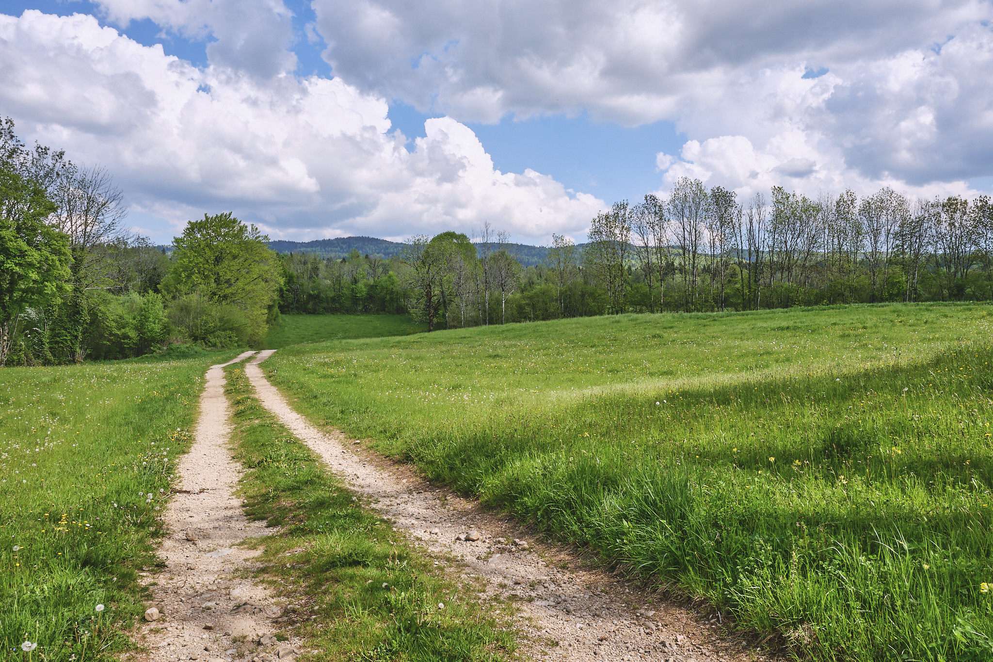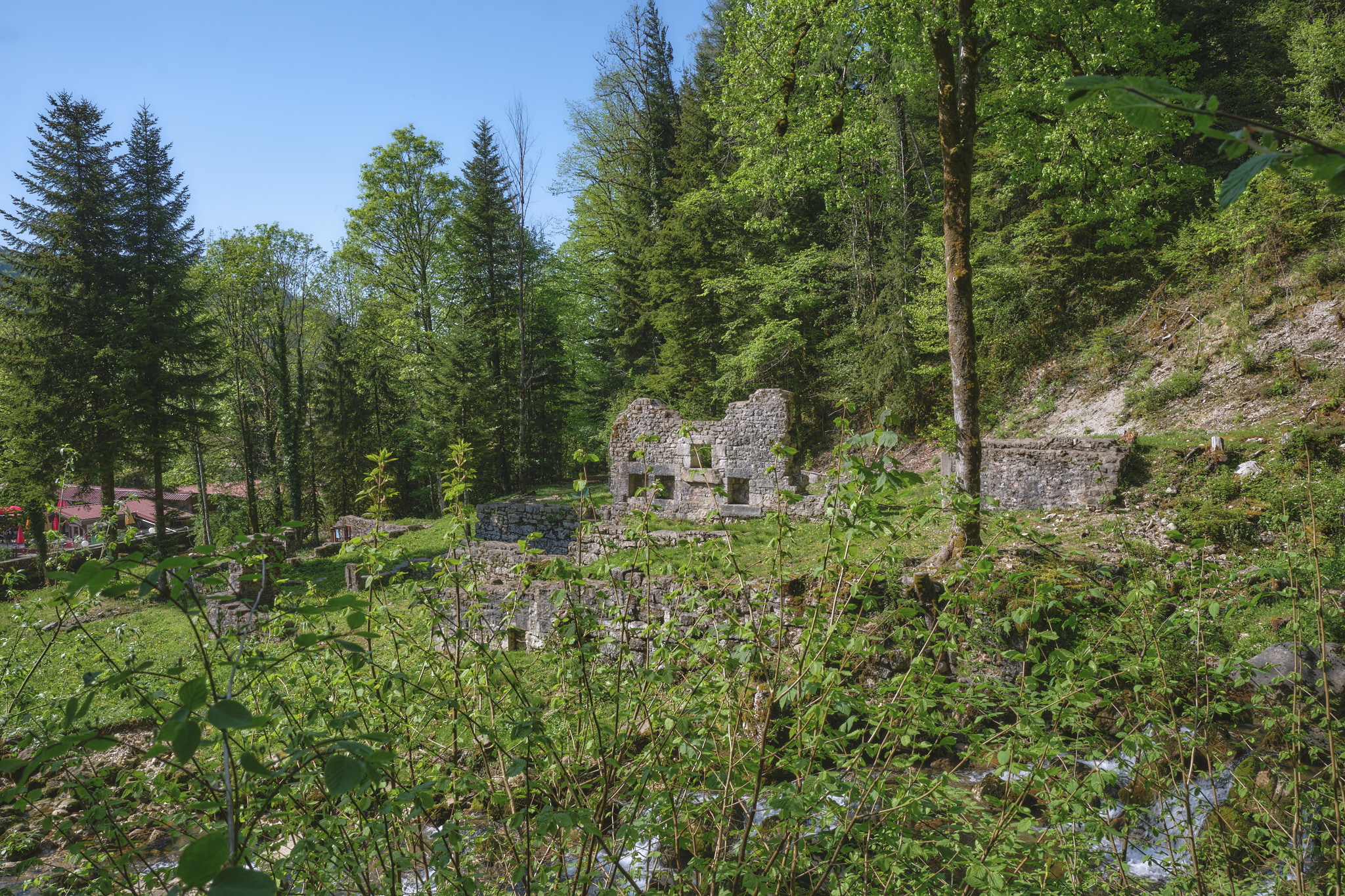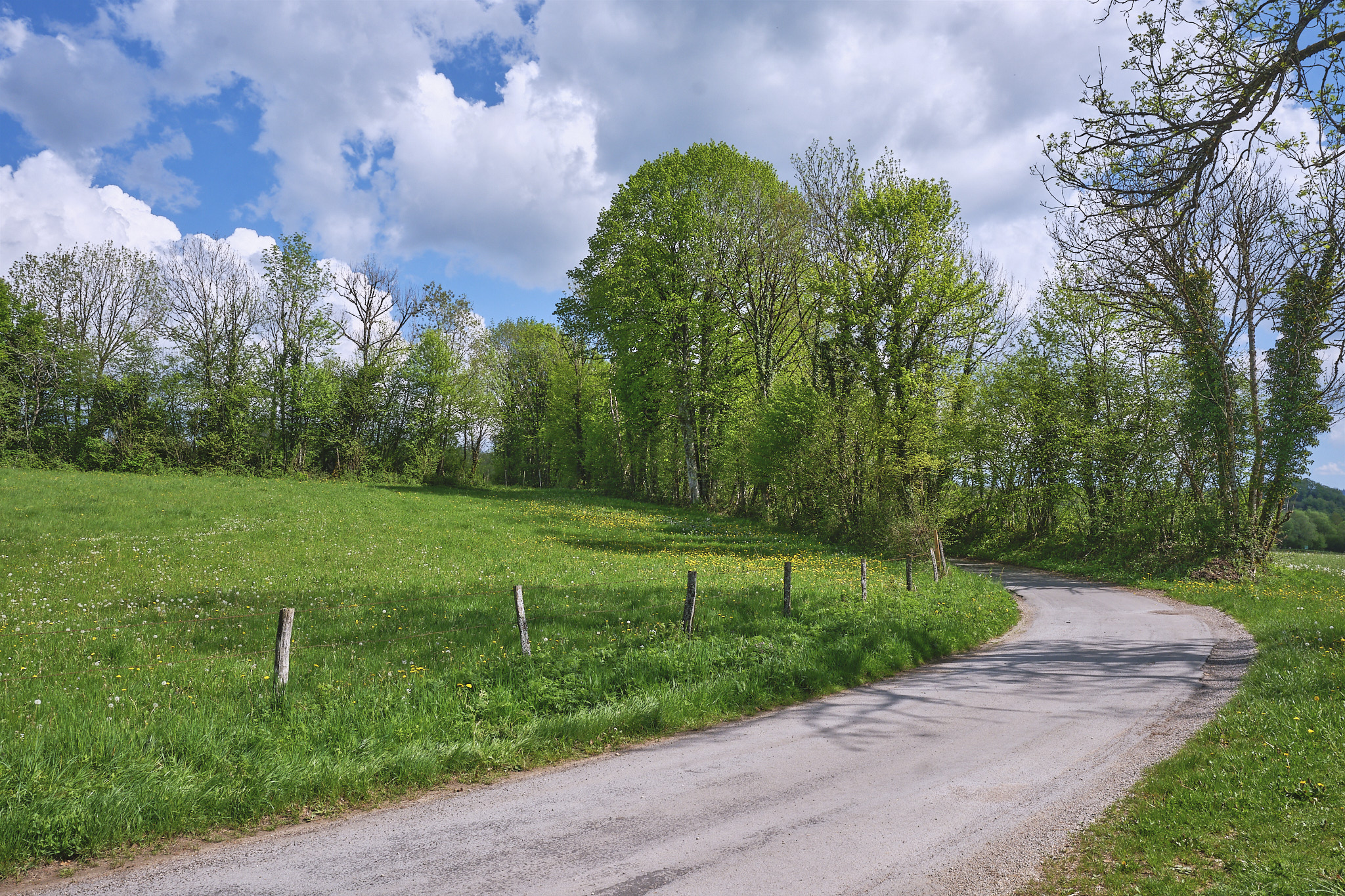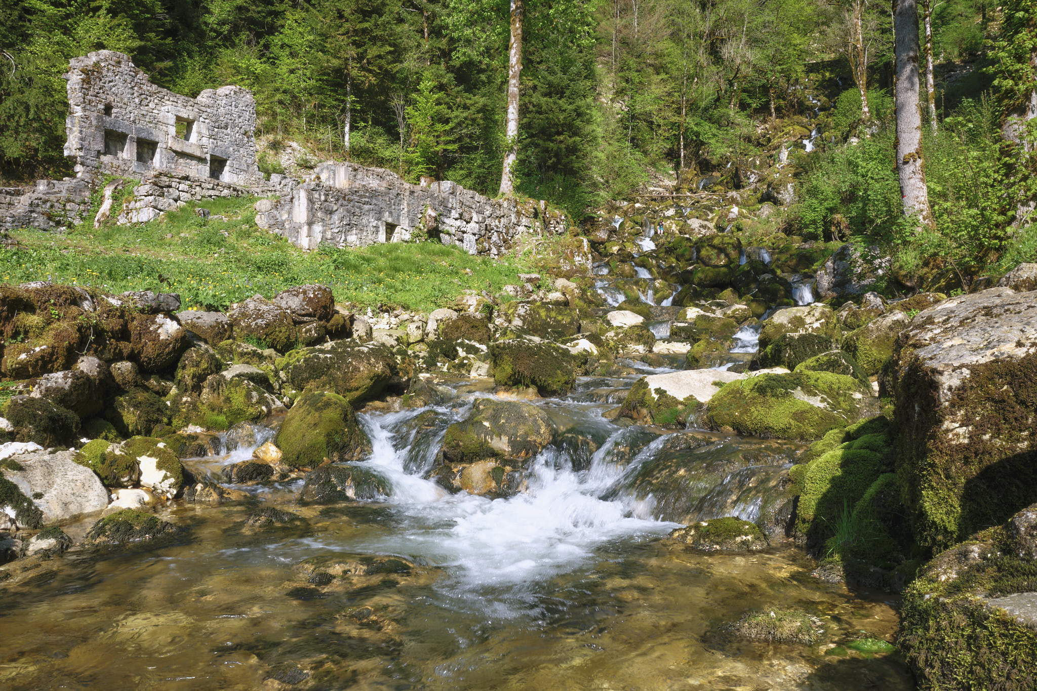 Au fond de la Reculée de La Frasnée naît le Drouvenant depuis une nappe souterraine sous le plateau.